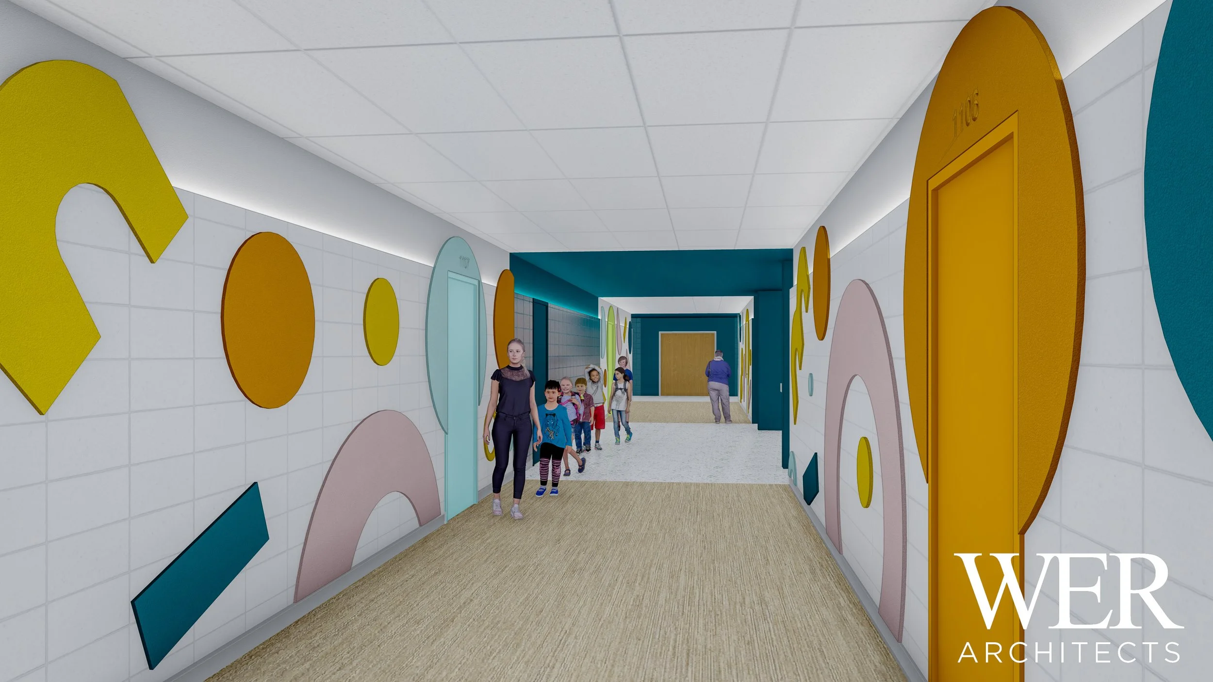 This project was designed in collaboration with the architects and designers at WER Architects with the intent of renovating a small elementary school within the constraints of a tight budget and timeline. The bright colors and fun shapes bring life to an otherwise plain corridor and the repetition of materials throughout aids in keeping the overall cost down.